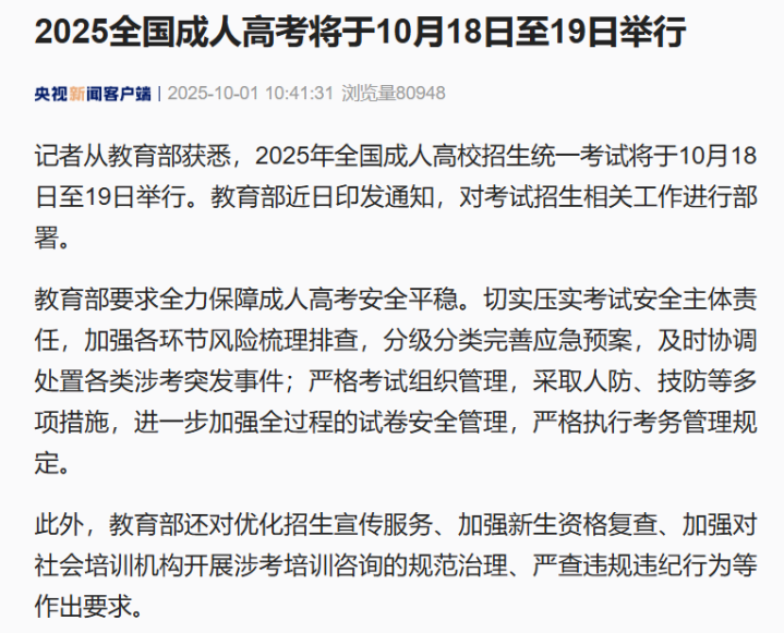 2025全国成人高考将于10月18日至19日举行, 教育部: 严查违规违纪行为